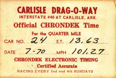 I had a friend whose brother was starting up a new business. It was called Racing Head Service. They offered to help if I would put their name on the car. The car in its stock form, would run mid 16s, but in a couple of seasons, with engine blueprinting, chassis work and a lot of tuning we had it running 13.70s to 13.80s on a regular basis. (This was on 7” cheater slicks and no track prep).