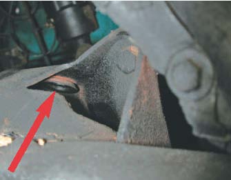 The new ShockWave shocks P/N 21-317 (included in kit P/N 21-318) require a little more clearance than the steel coils. Marked here is the area that must be trimmed. Don't worry, it will not alter the strength of the frame at all and if you do a nice job of cleanup you probably won't even know it was done.