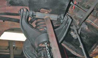 We decided to work at removing the spring by dropping the lower control arm at the cross shaft end. You'll note the lower ball joint is under the arm so it would have to be lifted up while the inner end can just be dropped down. Be careful, work intelligently, and stay safe. It is best to install a coil spring compressor at this point to keep the spring from flying out and damaging you or the car!