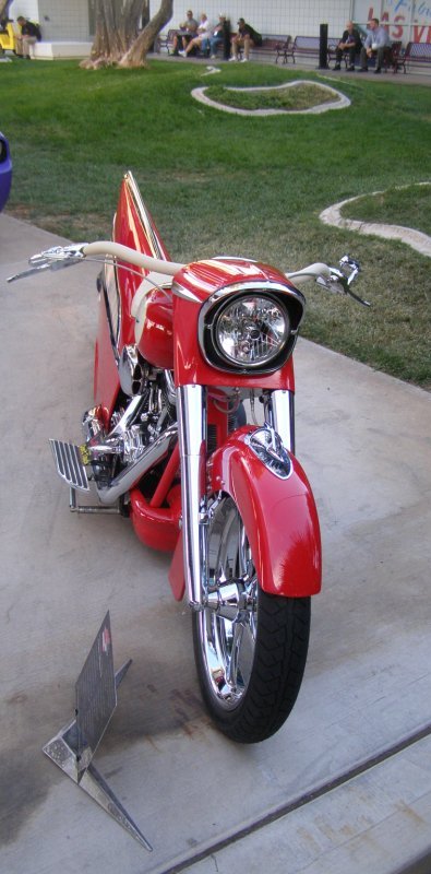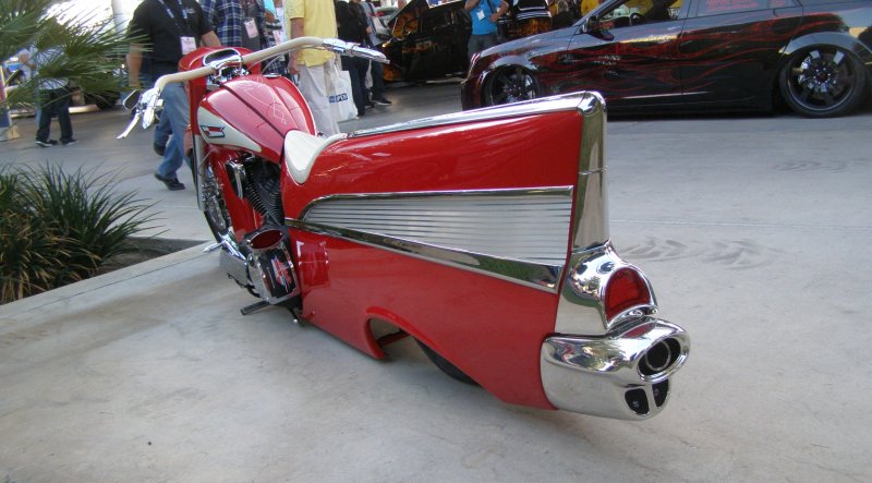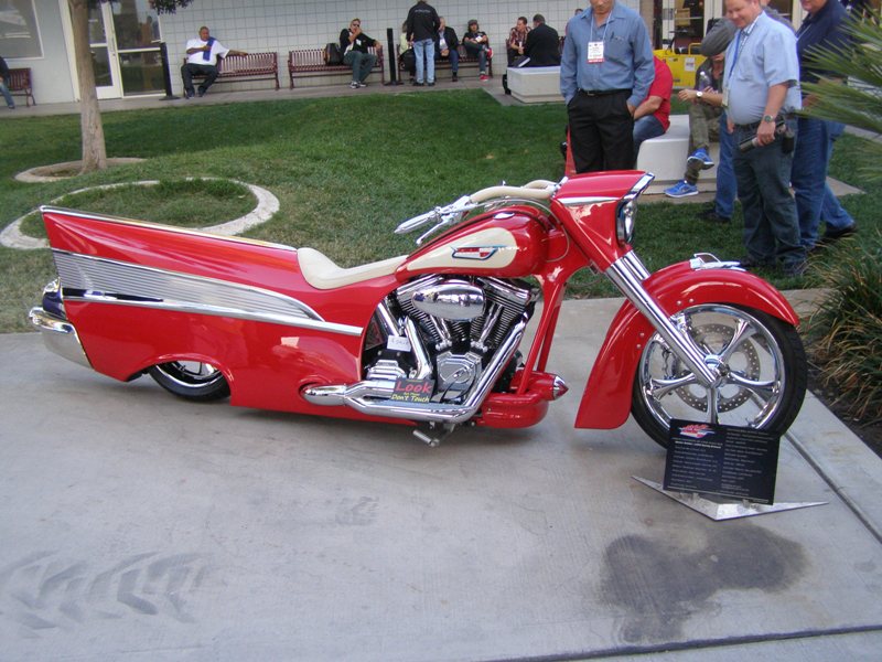 Take a 2008 Harley Davidson Dyna Street Bob motorcycle, add vast amounts of ingenuity, imagination and innovation and blend with over 3,000 hours of labor and you might end up with this homage to the ever popular, instantly recognized 1957 Chevrolet Bel Air.Ā This red beauty was recently seen at the SEMA (Specialty Equipment Market Association) Show held in Las Vegas, Nevada .