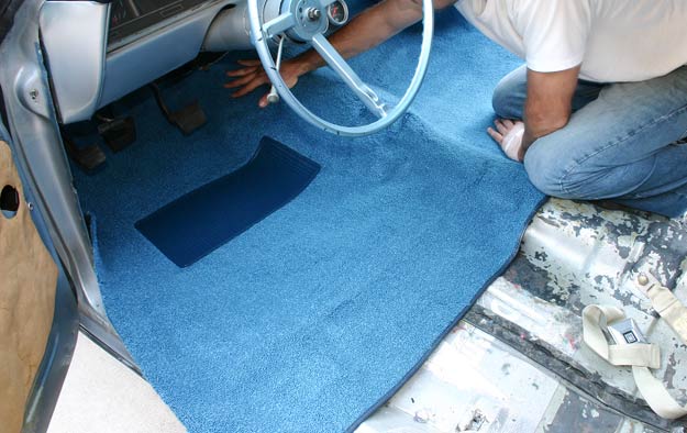 Depending on the car, the front section of the carpet can prove to be a little more involved than the rear, and in need of greater modification. Obviously, floor shift/console cars will need to be heavily cut around the shifter area to fit. Start by loosely fitting the rug into a position that will cover the entire area of the pan. Most of the time, there is plenty of excess carpet on all sides to allow for necessary trimming. Use the center hump in the floor pan as the focal point- working down from the hump into the passenger and the driver side pan. In tightly bunched areas, apply direct heat to the plastic backside of the rug with a heat gun. This will result in a softer, much more flexible material to work with temporarily. At this point, spray the back of the carpet with adhesive and stretch it into place. If the problem still persists, you may need to cut a small slit into the rugā forcing it to lie flat without bunching up or creasing.