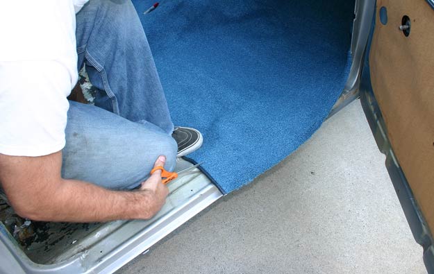 Laying the carpet is a relatively basic procedure, but requires much attention to detail for the best results. Most aftermarket carpet kits are pre-molded and designed to fit the shape and contour of the factory floor pan. Since the front piece always overlaps the rear, I have found it easier to install the rear section of the carpet first. Place the rug into the rear floorboard area and glue it down in the corners with some spray adhesive. The rear top flap of excess carpet should also be folded over and glued down to sit under the bottom of the rear seat. Each side will most likely require minor trimming to neatly tuck the carpet back underneath the rear panels and the windlace. Take your time and be careful not to cut too much. Your patience will definitely pay off in the long run.