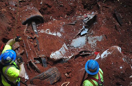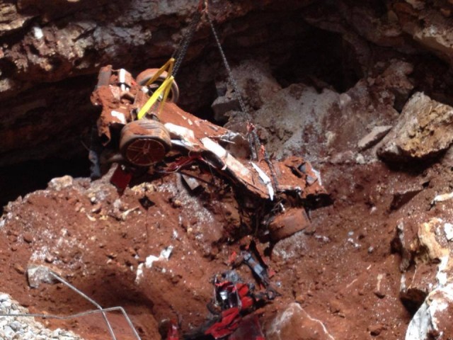 Predictably, the Mallett Hammer appears to be in the worst shape of all the Corvettes which fell victim to the hole. The Corvette Museum was only able to photograph the cars underside, as the rest of the car is completely buried under rocks and dirt. Teams attempting to extract the car have been pouring water into the hole to try and make mud, which is easier to vacuum up out of the hole than dirt. The rocks on top of the car must also be removed individually to prevent the debris from shifting and re-burying the car.