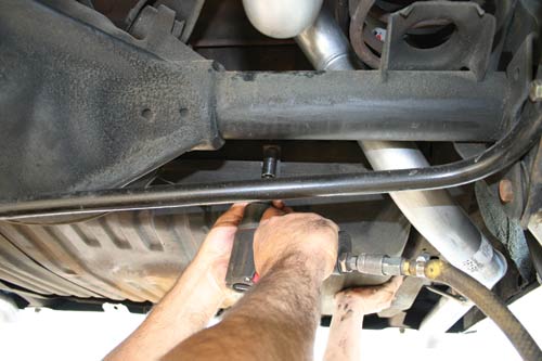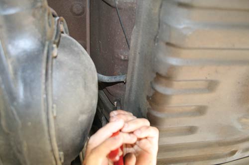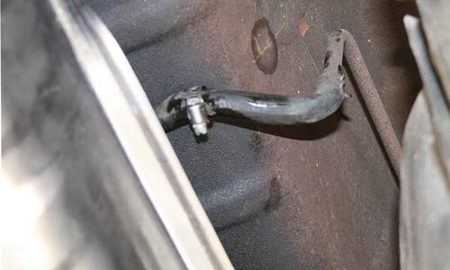 The flexible hose that connects the hard fuel line to the line that comes off the sending unit is removed.