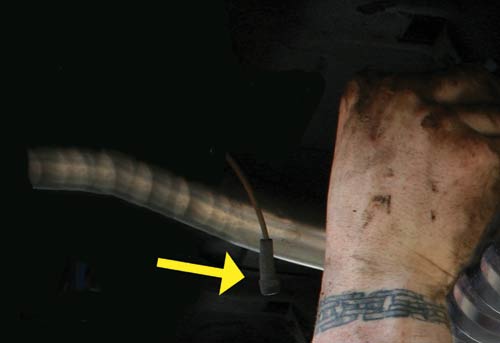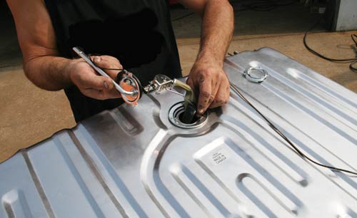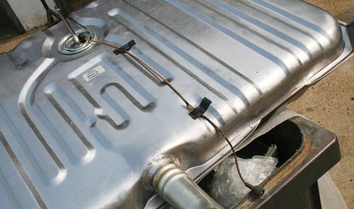 The hard line coming off the tank (out of the sending unit) is connected back to the main fuel line. We also connected the ground wire leading off the sending unit to its original spot on the Chevelle’s undercarriage.