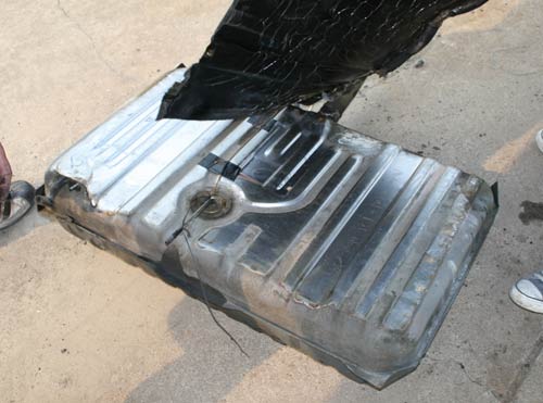The grimy old tank is removed. It was about a 1/4 full of gas, which we eventually drained and put into the new tank.