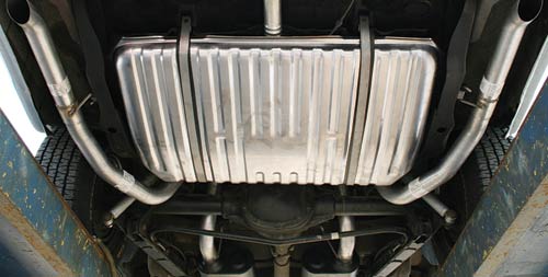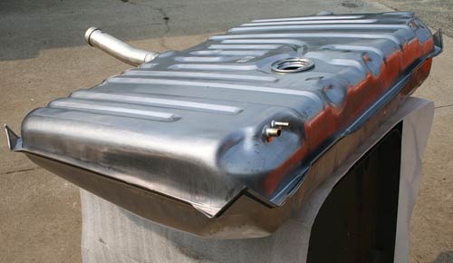 Here we are, all done. The shiny new tank matches that new exhaust system nicely! It especially looks great against the freshly undercoated trunk pan section. We fed the approximately 5 gallons of fuel we had in our old tank to our new one.