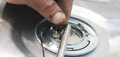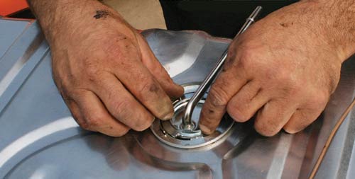 The retaining ring twists into place, securing the sending unit in position in the top of the tank’s opening.