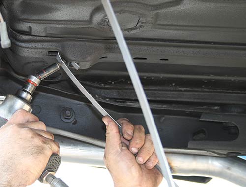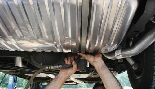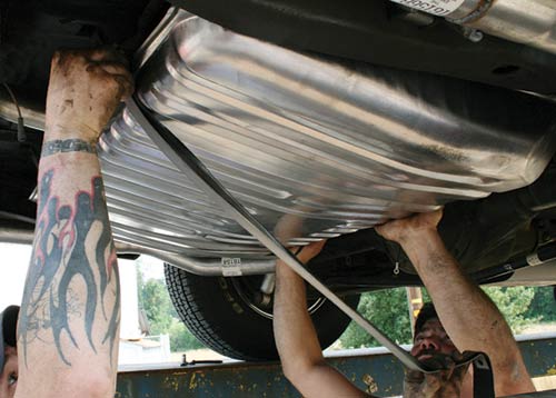 Here we’re getting the new tank into position. Be sure the new anti-squeak rubber strips are fitting properly between the mounting straps and tank. This is another step where an extra set of helping hands comes in handy! http://www.ecklerschevelle.com/chevelle-gas-tank-anti-squeak-set-1964-1983.html