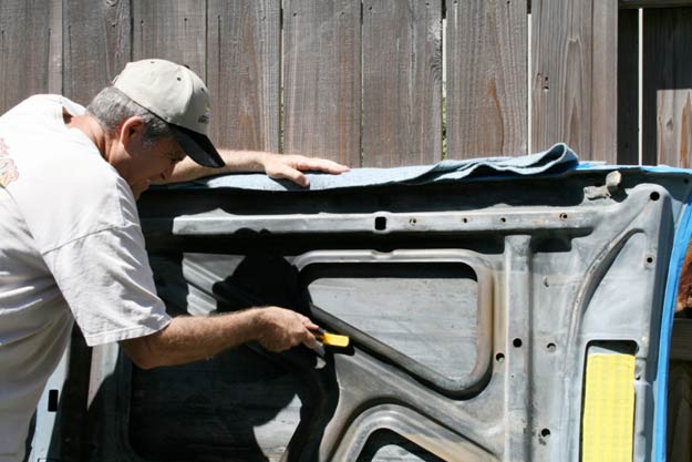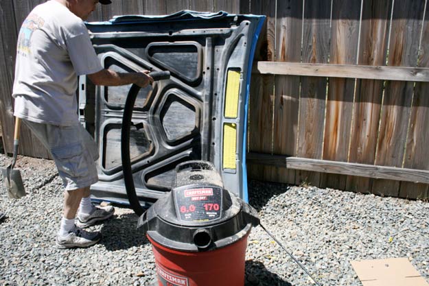 Before priming, we used a shop vac in the “blowing” mode, and blew off paint dust, steel wool debris, etc.