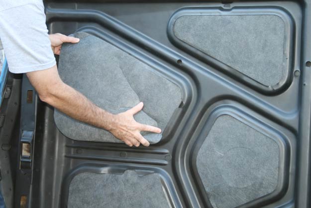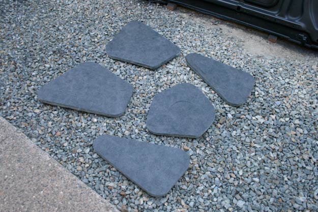 Here’s our new under hood insulation kit. This stuff is great! It’s an exact replacement part made of flame resistant fiberglass material, and it’s cut to fit our car’s under hood cut-outs perfectly.