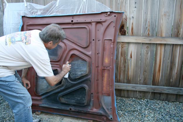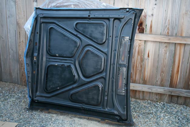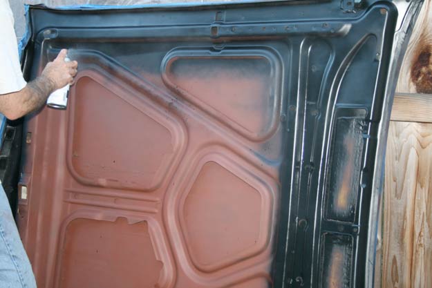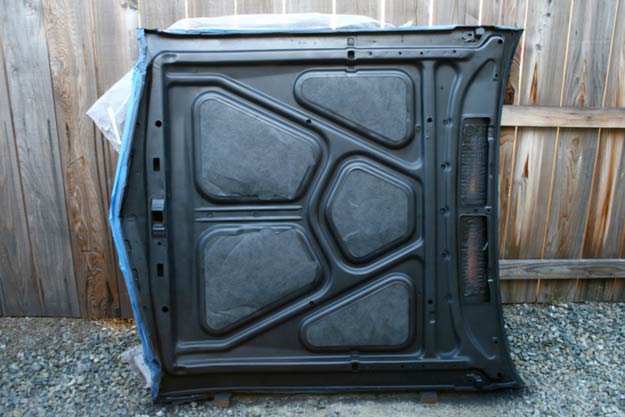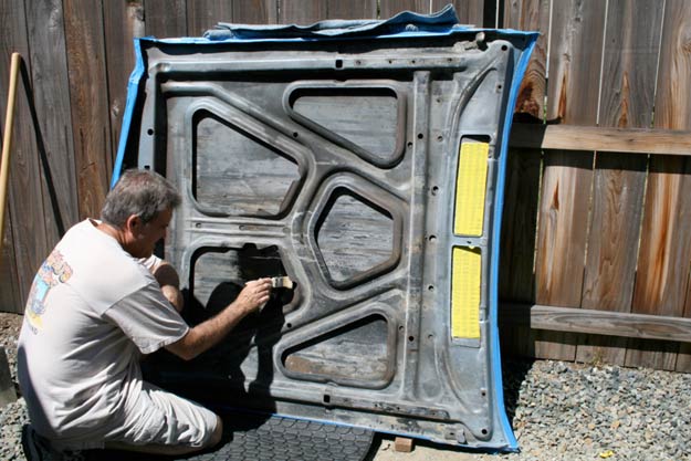 A small section had some semi-serious rust happening. Nothing to get too excited about, but left unchecked, over time this could have led to perforation. On a freshly-painted hood, that would have, well, sucked. Some light wire-brushing, followed up with a couple of coats of POR-15, and all was right once again. In case you haven’t heard, POR-15 is a rust preventative paint that stops rust in its tracks. A must on projects like these.