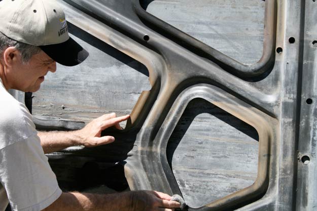 Here we’re using a wire scrub brush to remove grease, grime, overspray, and various other debris that makes the underside of the hood look downright terrible.