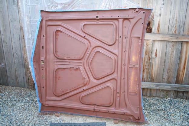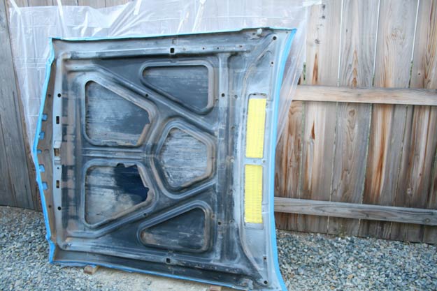With the top side of the hood completely masked off, we set the hood against a fence. We used a couple of wood blocks to set the hood on— keeping it off the actual ground.