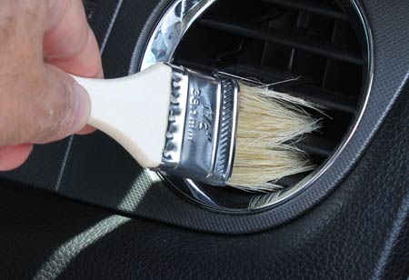 Instead of trying to wedge a tissue or a rag between those interior vents, try using a paintbrush. It gets into the tight spots. A cotton swab also works well. The paint brush can also be used for cleaning dust and debris out of other tight interior areas, such as where the corners of the dash meet up with the windshield pillars.